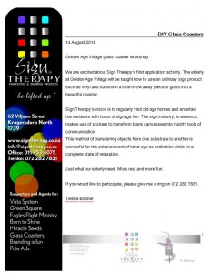 14 August 2014 Golden Age Village glass coaster workshop: We are excited about Sign Therapy’s first application activity. The elderly at Golden Age Village will be taught how to use an ordinary sign product such as vinyl and transform a little throw away piece of glass into a beautiful coaster. Sign Therapy’s …